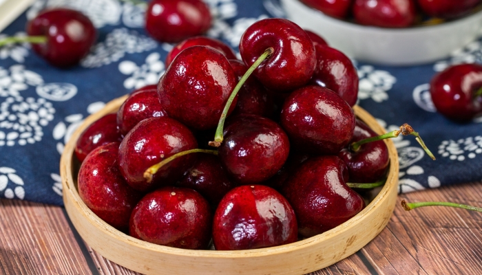 车厘子是一种市面上极其受欢迎的水果,属于樱桃的一种,又叫大樱桃。不同地区的车厘子季节也不同,国产车厘子在5~6月成熟,美国车厘子在6月中旬成熟,智利车厘子在12月成熟。车厘子多呈暗红色,也有红、黄色,直径较大,新鲜的车厘子较硬,果柄较长。果实宽心脏形,双肩凸起、宽大,有胸凸。成熟时果实颜色从鲜红色渐至黑紫,油润黑亮,果肉酸甜适口,果柄细长,果个较大,平均单果重12.9克,果皮厚韧,弹性强,甜香味浓。