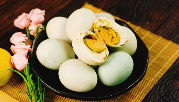 7、煮熟食用:腌制好的咸鸭蛋需要煮熟后才能食用。将咸鸭蛋放入锅中,加入适量的水,大火煮开后转小火煮20分钟左右。煮熟后的咸鸭蛋冷却后即可食用,也可以放在冰箱中保存。