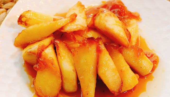 5、将入好味的山药条摆入盘中,浇上蓝莓酱即可。