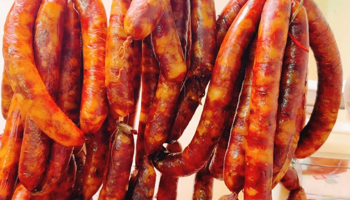 所需食材:大米400克、鸡蛋1个、油菜1棵、香菇4朵、蒜苗1根、广式腊肠4根、麻辣腊肠1根、姜老抽、鸡精、玉米油、芝麻油、白胡椒粉、味极鲜酱油
