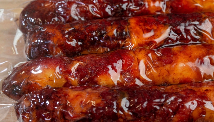 广式腊肠因其独特的咸甜味道和鲜美口感而备受食客的喜爱,广式腊肠以色泽红润、肥瘦相间、咸鲜适中、软硬适宜等特点而出名。传说最早的广式腊肠起源于明朝中叶的广东,当时的广式腊肠是用猪肉加上各种调料,再通过烟熏制作而成。到了清代,广式腊肠逐渐发展成为一种主要的肉制品,成为家庭和餐馆饮食中的重要组成部分。广式腊肠的制作方法和配方如下: