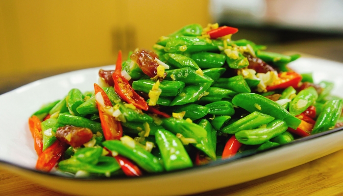 5、配菜炒或煮:先把灌肠在锅中用清水焯熟,这样味道多少可以淡一点。然后将灌肠和其他蔬菜一起炒或炖,吸收其咸味。根据灌肠咸的程度调整配菜的多少。